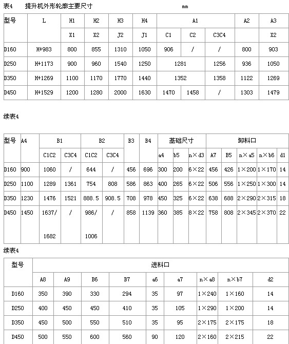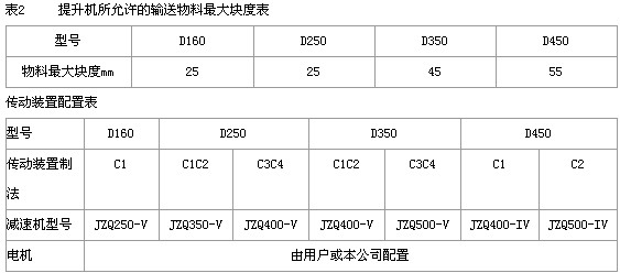 D型斗式提升機是采用橡膠輸送帶為牽引機件,適用于輸送粉狀、粒狀及小塊狀的無磨琢性、半磨琢性的物料,如煤、水泥、石塊、砂、粘土、碎礦石等。被輸送物料溫度不超過80℃。 本提升機有兩種料斗.-深圓底型料斗和淺圓底型料斗. 深圓底型料斗適于輸送干燥的,松散的,易于拋出的物料,如水泥、煤塊、干砂、碎石等. 淺圓底型料斗適于輸送潮濕的,容易結塊的,難于拋出的物料,如濕砂、型砂等. D型斗提機有四種規格。 D160,D250,D350,D450。 輸送量在3.1~66m3/h之間,提升高度在4~30m范圍內. D型斗提機為便于使用,具有不同制法和裝法 1、料斗 S制法-帶有深圓底型料斗;Q制法-帶有淺圓底型料斗 2、按上部區段卸料口型式分為: X1制法-帶有傾斜法蘭盤的卸料口;X2制法-帶有水平法蘭盤的卸料口. 3、按提升機傳動裝置的相對位置分為: 左裝和右裝 4、按下部區段進料口型式分為兩種 J1制法:進料口的底與水平面成45°角;J2制法:進料口的底與水平面成60°角。 5、按中間機殼側面檢視門分為四種 K1制法:中間機殼帶有下端左檢視門;K2制法:中間機殼帶有下端右檢視門; K3制法:中間機殼帶有上端左檢視門;K4制法:中間機殼帶有上端右檢視門。 6、按中間機殼端面檢視門分兩種 Z1制法:中間機殼帶有下端檢視門;Z2制法:中間機殼帶有上端檢視門。 ★ 技術參數